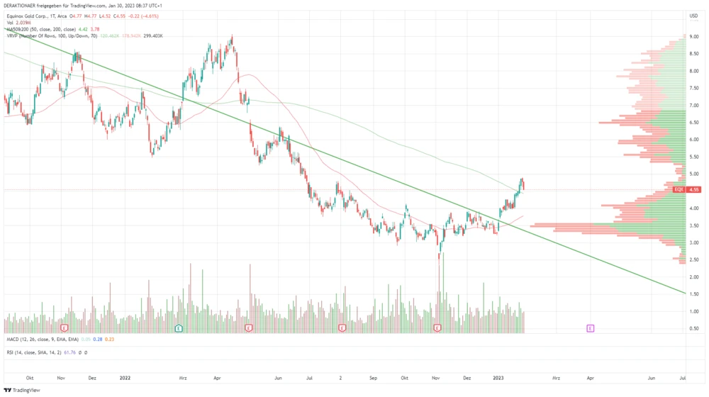 Wie bereits in Ausgabe 52/22 + 01/23 erklärt, ist die Achillesferse von Equinox die hohen Produktionskosten (AISC). Diese lagen laut dem Q4-Bericht bei rund 1.750 Dollar, der Goldpreis zum Zeitpunkt der Empfehlung bei circa 1.800 Dollar. Seitdem legte die Aktie rund 30 Prozent zu, um das Ziel zu erreichen, müsste sie insgesamt auf 147 Prozent Zugewinn kommen.