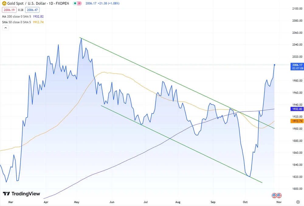 Seit dem Angriff der Hamas auf Israel am 7. Oktober ist der Goldpreis von etwa 1.815 Dollar auf nun über 2.000 Dollar gestiegen. Ein mittelfristiger Abwärtstrend-Kanal konnte nachhaltig nach oben verlassen werden.