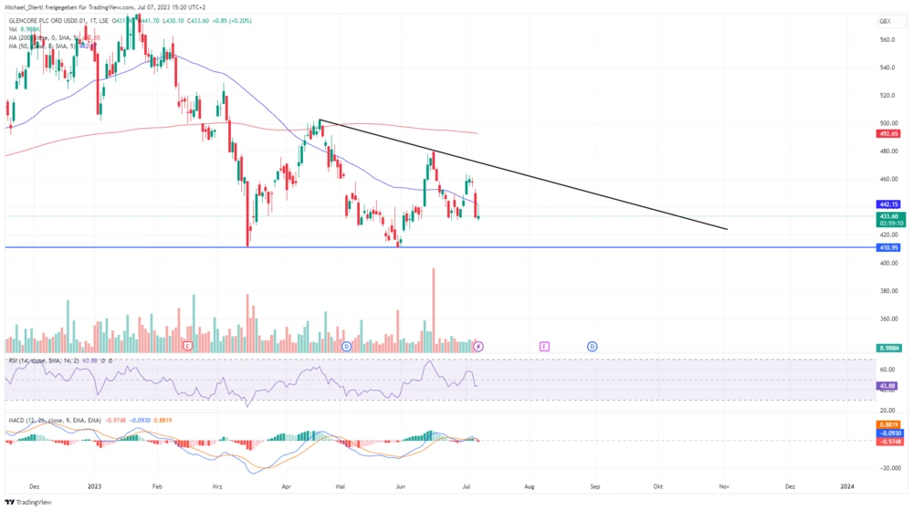 Um das durchschnittliche Kursziel der Analysten zu erreichen, muss die Rohstoff-Aktie allerdings zunächst ihre Konsolidierung beenden. Diese findet derzeit in einer Dreiecksformation statt und könnte sich deshalb durchaus noch einige Wochen ziehen. Doch sobald der Kurs den Sprung über die schwarze Abwärtstrendlinie schafft, sollte der Weg in Richtung GD200, der aktuell bei 492,65 Pence verläuft, und anschließend der psychologisch wichtigen 500-Pence-Marke, frei sein.
