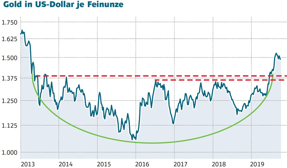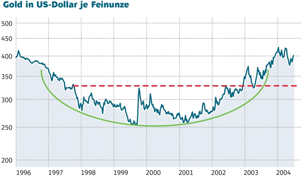 Interessant ist: Vergleicht man die Chartformation, die sich in den vergangenen Jahren bei Gold ausgebildet hat, dann sieht man eine ähnliche Untertassenformation, wie Gold über die Jahrtausendwende ausgebildet hat. Und diese Chartformation bildete die Grundlage für den Anstieg des Goldpreises von damals 300 auf über 1.900 Dollar. Wiederholt sich die Geschichte? Nein, sicherlich nicht. Aber manchmal reimt sie sich. Zu Beginn des Jahres 2003 setzte der Goldpreis damals noch einmal unter das Ausbruchsniveau zurück. Im Nachhinein eine klassische Bärenfalle. Sehen wir dieses Mal eine ähnliche Entwicklung, könnte Gold noch einmal unter das Ausbruchsniveau von 1.375 Dollar zurücksetzen. Ein solches Szenario würde die Bären sofort wieder auf den Plan rufen. Doch auch das könnte nur eine Bärenfalle sein.