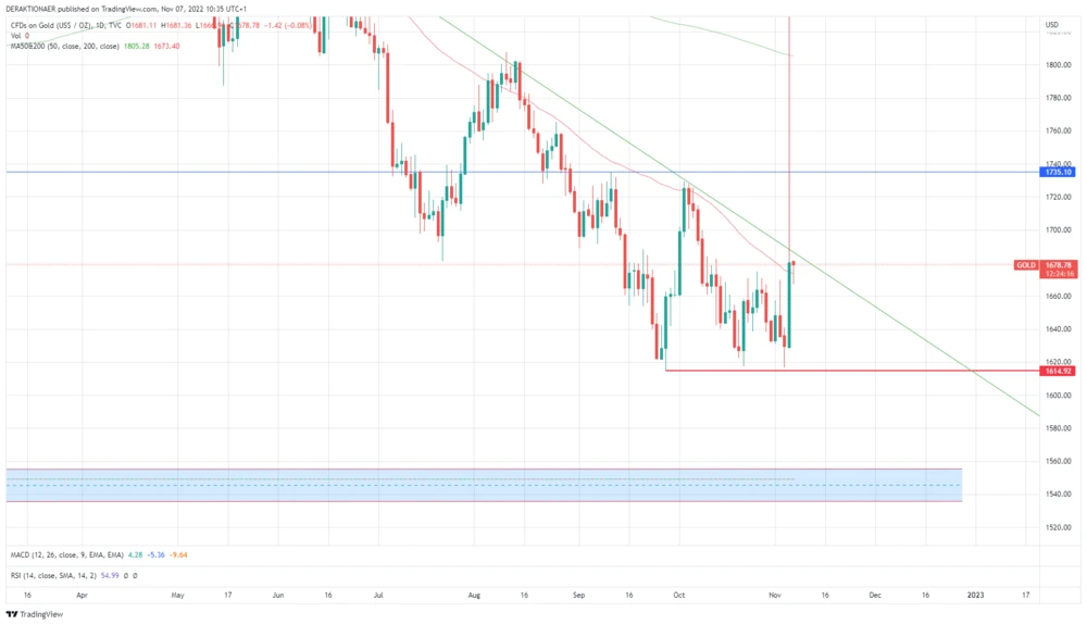 Gold hat sich damit nicht nur aus seiner prekären Lage befreit, sondern auch den GD50 bei 1.673,36 Dollar zurückerobert. Als nächstes steht den Bullen die seit Juni intakte Abwärtstrendlinie bei circa 1.685 Dollar im Weg. Schaffen sie es, den Preis darüber zu bewegen, dann ist das nächste Ziel das September-Hoch bei 1.735,10 Dollar.