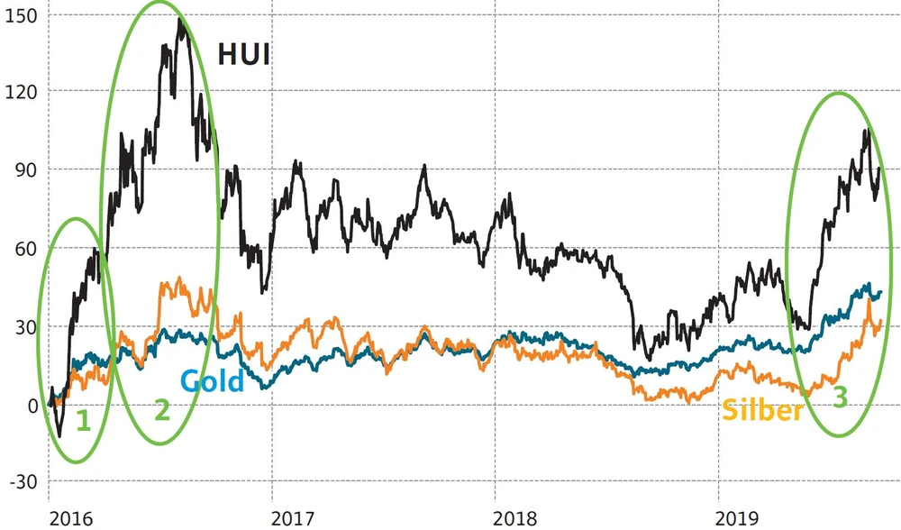 Richtig ist: Gold hat mit 1.550 Dollar ein neues 6-Jahreshoch erreicht. Die Minenaktien, egal ob man sie am GDX oder am HUI misst, haben allerdings noch kein neues Hoch erreicht. Und das überrascht (negativ), schließlich notiert Gold rund 175 Dollar über dem Hoch aus 2016. Da sich ein höherer Goldpreis unmittelbar auf die Gewinne der Minenaktien auswirkt, sollten die Minen deutlich besser laufen als Gold – zumindest dann, wenn der Markt eine Nachhaltigkeit des Anstiegs bei Gold unterstellt. Mit anderen Worten: Gold könnte noch einmal vor einem Abverkauf stehen.