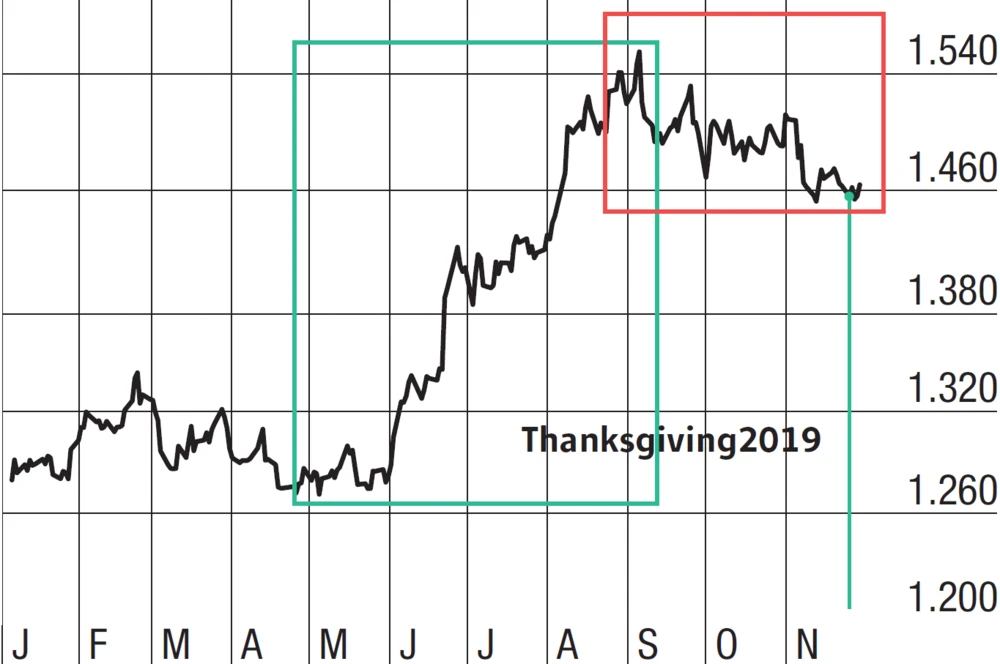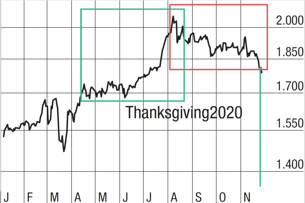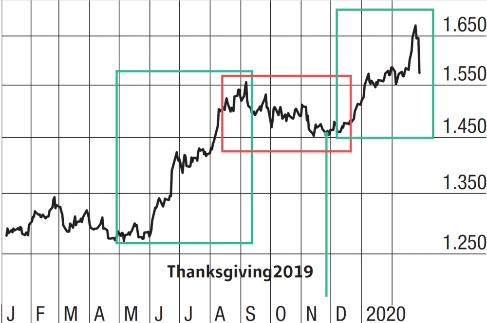 Nun, an der Stelle will ich mit Ihnen einen Blick auf das vergangene Jahr werfen. Und es tun sich doch erstaunliche Parallelen auf. Sowohl 2019 als auch 2020 hat der Goldpreis über den Sommer hinweg eine Rallye auf das Parkett gelegt (grünes Kästchen in den Charts). Ab August trat Gold dann in eine Konsolidierung ein (rotes Kästchen in den Charts), die bis Thanksgiving/Anfang Dezember reichte. Anschließend, das sehen Sie im dritten Chart, schloss sich wieder eine Rallye an (zweites grünes Kästchen im dritten Chart).