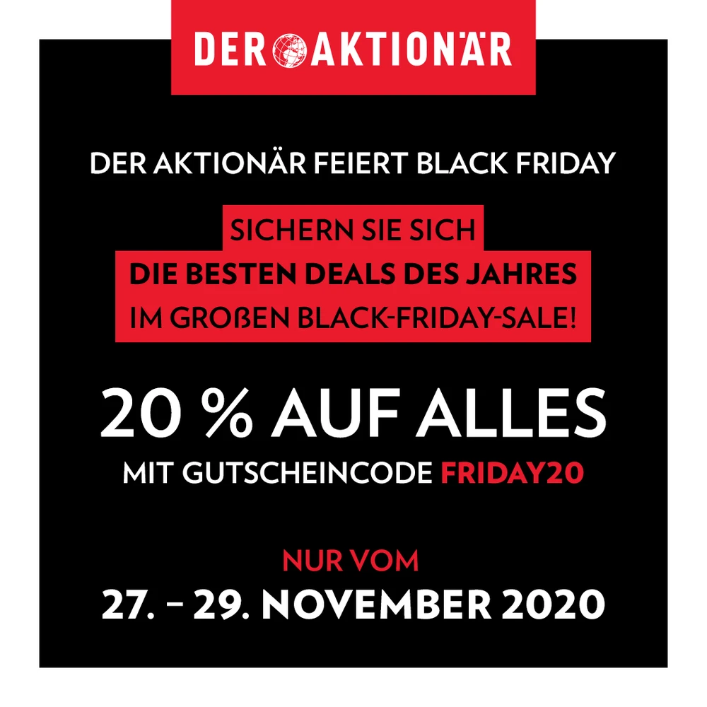 Zu guter Letzt darf ich Sie heute noch auf eine Aktion der Börsenmedien AG hinweisen, die nur noch wenige Stunden läuft: Blackfriday. Mit dem Code FRIDAY20 erhalten Sie 20 Prozent Rabatt auf fast alle Produkte aus dem Haus der Börsenmedien AG. Goldfolio kostet Sie also nicht einmal 400 Euro für die kommenden 12 Monate – und das zu einem Zeitpunkt, der kaum besser für einen Einstieg sein könnte. Schließlich kauft man lieber am Boden und nicht am Top.