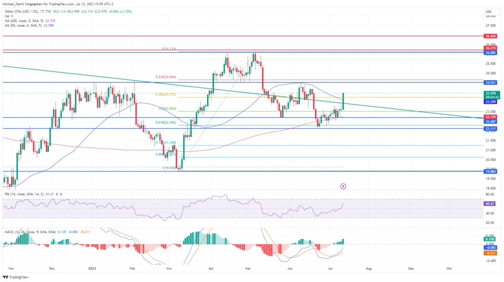 Noch stärker als Gold zeigte sich der Silberpreis. Er schoss in kürzester Zeit um fast einen Dollar nach oben, überwand den GD50 bei 23,59 Dollar und notiert nur noch knapp unter der 24-Dollar-Marke. Auch bei Silber hielt das 61,8%-Fibonacci-Retracement der vorangegangenen Aufwärtswelle bei 22,29 Dollar dem Abwärtsdruck stand. Nun gilt es, das Juni-Hoch bei 24,52 Dollar zu überwinden, um das Ende der Korrektur zu bestätigen.