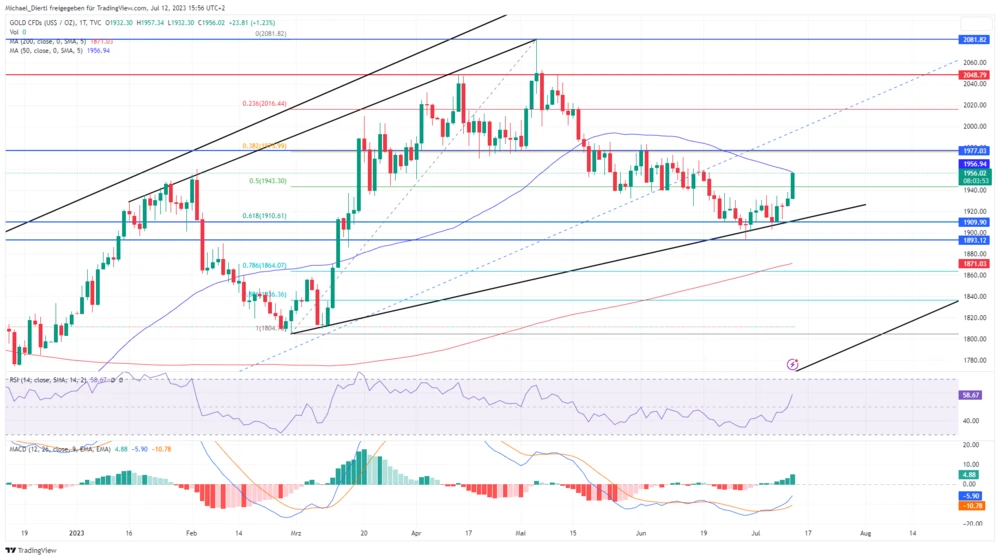 In Reaktion auf die Daten übersprang der Goldpreis die Marke von 1.950 Dollar und markierte damit den höchsten Stand seit Ende Juni. Aus technischer Sicht haben sich damit sowohl das 61,8%-Fibonacci-Retracement der vorangegangenen Aufwärtswelle bei 1.919,61 Dollar als auch die psychologisch wichtige 1.900-Dollar-Marke als Unterstützungen bewährt. Als nächste Hürde steht dem Goldpreis der GD50 bei 1.956,88 Dollar gegenüber.