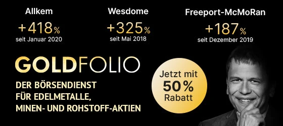 Sollte der Goldpreis wie erwartet in den kommenden Wochen steigen, bieten Minen-Aktien eine hervorragende Möglichkeit, überproportional davon zu profitieren. Im Goldfolio, dem Börsenbrief von Edelmetallexperte Markus Bußler, erhalten Leser exklusive Empfehlungen zu den besten Aktien aus dem Minensektor. Nutzen Sie jetzt die Möglichkeit, 50 Prozent der Abonnementgebühren zu sparen!