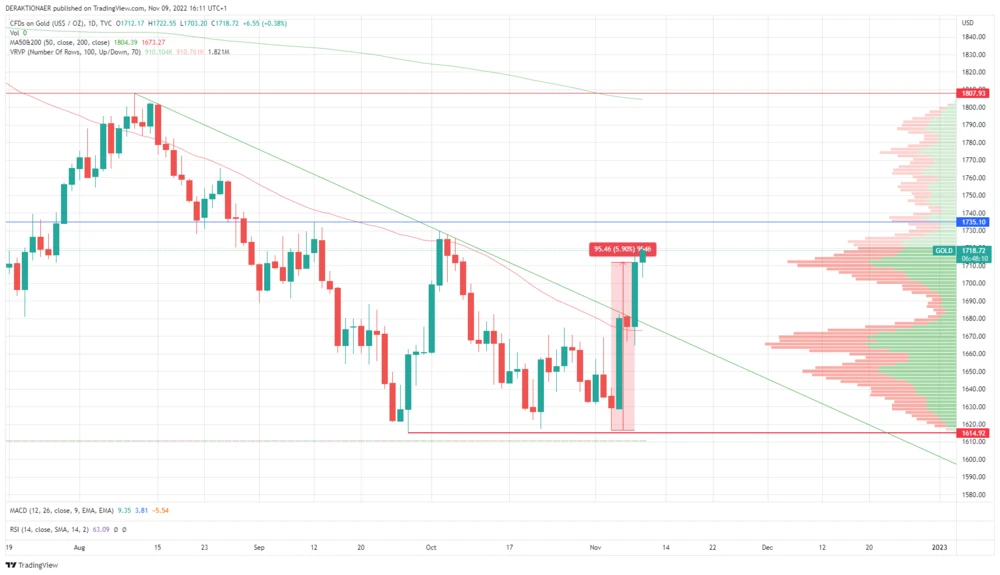 Der Goldpreis hat binnen weniger Handelstage 5,9 Prozent zulegen und damit den mittelfristigen Abwärtstrend brechen können. Nach einer zu erwarteten Konsolidierung sollte die Feinunze zuerst das September-Hoch bei 1.735,10 Dollar und anschließend den GD200 bei 1.804,35 Dollar in Angriff nehmen können.