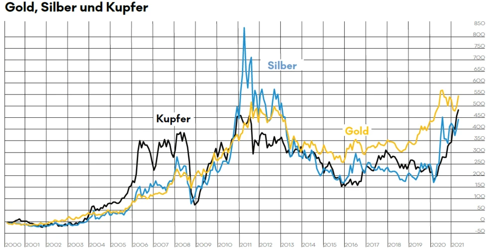 Man erkennt zunächst den langen Anstieg des Goldpreises. Vom Jahr 2006 bis zum Jahr 2012 konnte sich sein Preis mehr als verdreifachen. Grund für diesen fulminanten Anstieg war der gleichzeitige Rückgang der US-Anleiherendite von fünf Prozent auf 1,5 Prozent wegen der sinkenden langfristigen Inflationserwartungen in dieser Zeit. Der Kupferpreis konnte währenddessen per Saldo nicht steigen. Silber hingegen konnte den Anstieg des Goldpreises nachmachen und sogar noch übertreffen. Damit steht fest, Silber wird an der Börse als Edelmetall und nicht als Industriemetall gesehen, sonst hätte es sich vom Jahr 2006 bis zum Jahr 2012 wie Kupfer verhalten und nicht wie Gold.