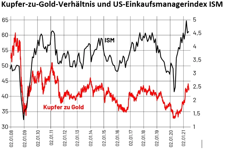 Ich habe einmal in der ersten Grafik das Kupfer-zu-Gold-Verhältnis über den US-Einkaufsmanagerindex ISM Manufacturing, der als Maßzahl für die US-Wirtschaftsaktivität gilt, gelegt.