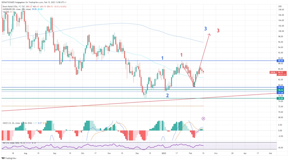 Das bestehende Eins-Zwei-Setup wird erst invalidiert, wenn der Ölpreis das Februartief bei 79,15 Dollar unterschreitet. Bis dahin bleibt die primäre Erwartungshaltung ein Ausbruch über das Jahreshoch bei 89,05 Dollar und anschließend dreistellige Kurse.