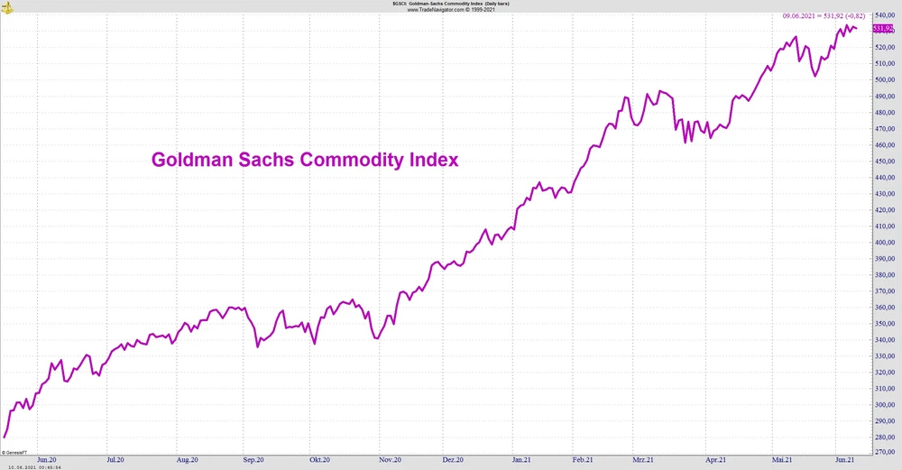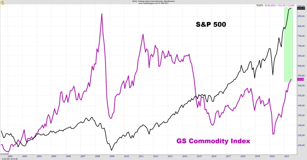 Vergleicht man die Performance des Goldman Sachs Rohstoff-Index mit der des S&P 500 so ist zu erkennen, dass in den Rohstoffmärkten eigentlich noch nichts passiert ist. Das mögliche Kurspotential ist enorm.