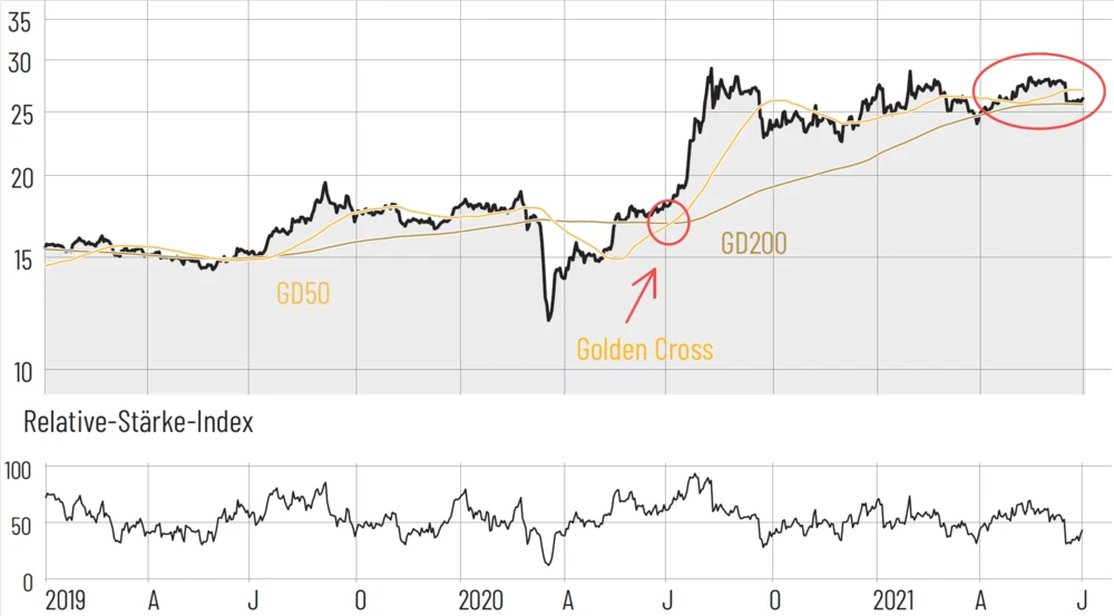Nummer 2 ist etwas, auf das kaum jemand achtet: Silber hat im Juli vergangenen Jahres ein Golden Cross gebildet. Und dieses Golden Cross hatte über die gesamte Konsolidierung, die Silber seit Herbst mit Gold zusammen durchlaufen hat, bestand. In den vergangenen Tagen drohte die 50-Tage-Linie die 200-Tage-Linie von oben nach unten zu durchstoßen. Doch dieses Death Cross konnte abgewendet werden. Auch hier: Ein deutlicher Anstieg des Silberpreises in den kommenden Tagen wäre wünschenswert, um die Nerven etwas zu beruhigen. Doch Stand heute hat das Golden Cross noch Bestand.