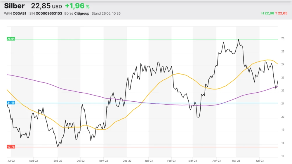 Beim Edelmetall zeigt sich aktuell ein interessantes Chartbild. Silber hat an der wichtigen 200-Tage-Linie aufgesetzt und ist von da nach oben abgeprallt. Sollte der Widerstand bei 24,50 Dollar überwunden werden dürfte es weiter Richtung der 26 Dollar-Marke gehen. Davon sollten Silberminen-Aktien überproportional profitieren.
