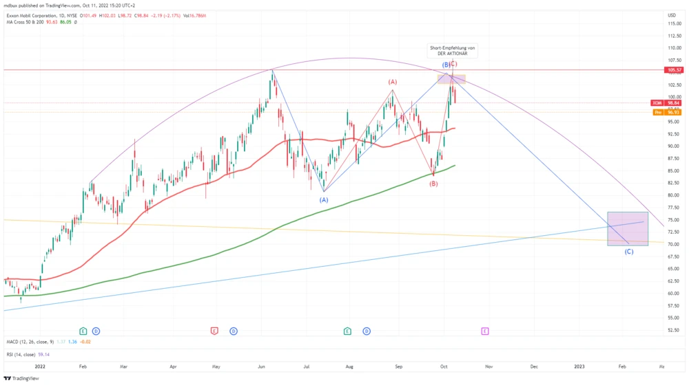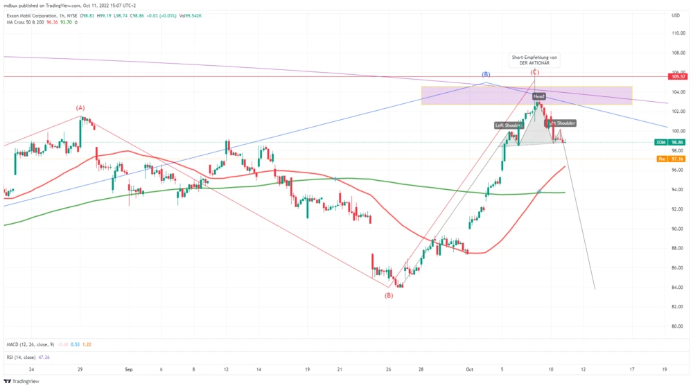 Der Kurs des Energieriesen hat, wie erwartet, über dem Zwischenhoch bei 101,56 Dollar gedreht und befindet sich nun auf dem Weg nach unten. Auf kleinerer Zeitebene bildet sich eine Schulter-Kopf-Schulter-Formation, die sich durch den Bruch der Nackenlinie bearish auflösen sollte.