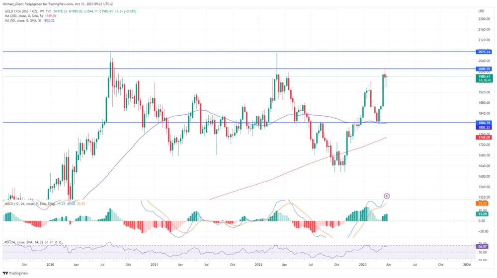Die jüngste Entwicklung im Goldpreis spricht jedenfalls für dieses Szenario. Obwohl die Unsicherheiten im Bankensektor abnehmen und die Aktienmärkte sich wieder freundlicher präsentieren, notiert das Edelmetall weiterhin nur knapp 100 Dollar unter seinem Allzeithoch. Sobald der Kurs es schafft, dieses zu überwinden, sollte Gold zumindest auf 2.250 Dollar ansteigen. Auch die prognostizierten 2.500 Dollar wären dann im Spiel – zwar höchstwahrscheinlich nicht bis zum Ende des zweiten Quartals, doch bis Ende des Jahres.