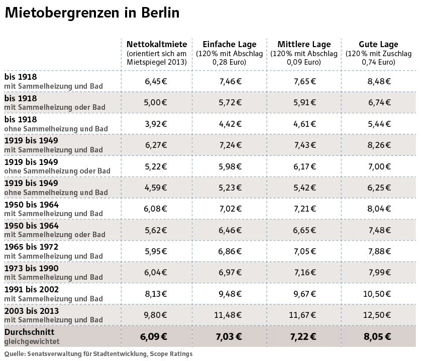 Des Weiteren sieht das Eckpunktepapier der Berliner Regierung vor, dass Mieten von mehr als 120 Prozent einer Höchstmiete, die der Senat in einer extra angefertigten Mietentabelle festgelegt hat (siehe Tabelle), neun Monate nach Inkrafttreten des Gesetzes auf 120 Prozent gesenkt werden müssen.