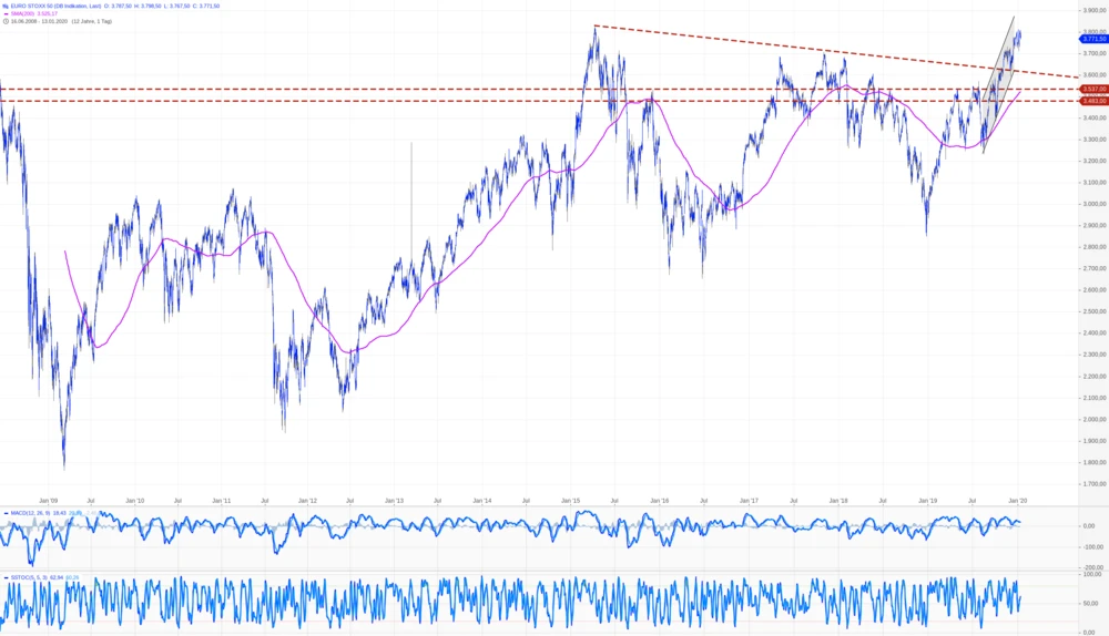 Der EuroStoxx 50 konnte nach fast 20 Jahren (!) seinen 2000´er- Abwärtstrend verlassen. Dieser hielt seit Ende März 2000 bis zum 04.12.2019 an. "Das Überschreiten der 3.650 Punktemarke war dann der entscheidende Befreiungsschlag. Mehr noch: Der vorherige Test mit einem kurzzeitigen “Abtauchen“ unter diese Linie manifestierte und bestätigte diesen Ausbruch sogar noch", sagt Chartexperte Martin Utschneider von Donner & Reuschel.