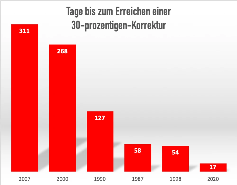 Es ist der schnellste Crash der Geschichte. Innerhalb von sieben Tagen verliert der DAX mehr als zehn Prozent, innerhalb von 14 Tagen mehr als 20 Prozent, nur drei Tage mehr, bis er 30 Prozent verloren hat.