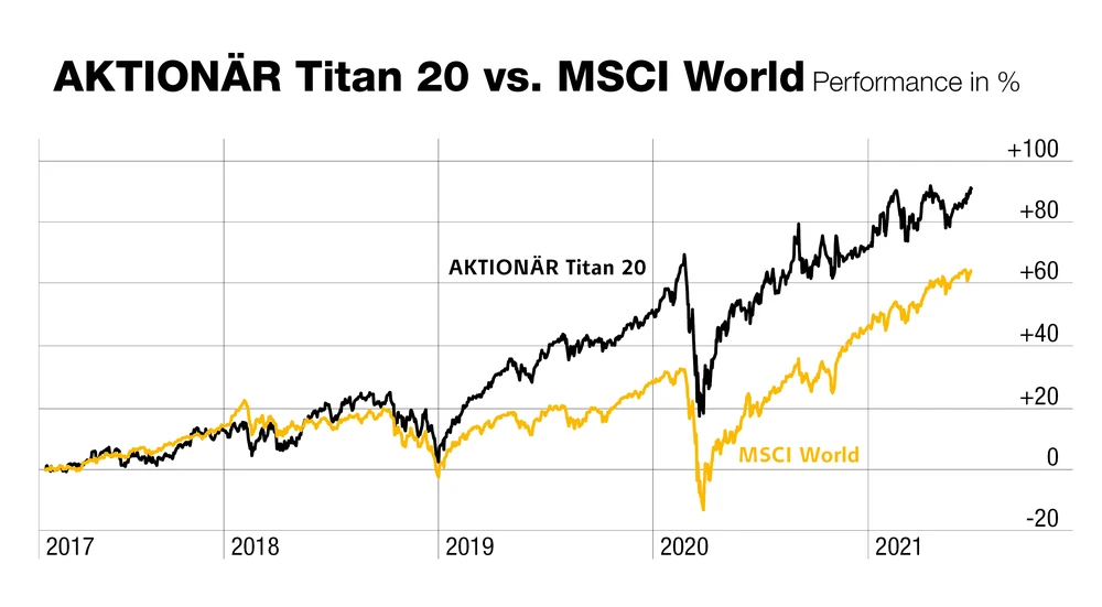 Wer nach geeigneten Anlagemöglichkeiten für den langfristigen Vermögensaufbau sucht, der landet zwangsläufig beim MSCI World Index. Der globale Aktienindex bildet die Kursentwicklung von rund 1.600 Aktien aus 23 Industrieländern ab und vereint dabei die größten und wichtigsten Unternehmen. So verzeichnete der MSCI World in den vergangenen fünf Jahren eine respektable Rendite von 9,9 Prozent pro Jahr. Nicht schlecht und doch nicht gut genug – denn hier zeigt sich die ganze Überlegenheit der Erfolgsstrategie des AKTIONÄR Titan 20 Index: Dieser bescherte über den selben Zeitraum gemessen den Anlegern eine Rendite von 16,1 Prozent pro Jahr und verweist damit den MSCI World klar in die Schranken.