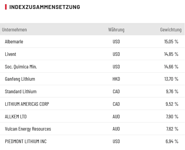 Die Vergangenheit hat gezeigt, dass Lithium-Aktien teils hochvolatil sind. Deswegen ist es sinnvoll, das Risiko auf mehrere Schultern zu verteilen. Mit dem Indexzertifikat – WKN DA0AAS – partizipieren Anleger 1:1 an der Entwicklung des Index.