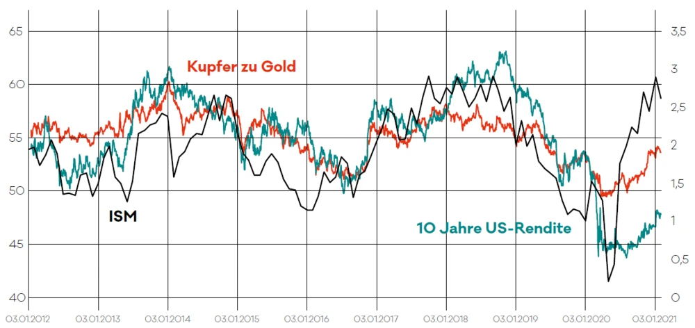 ISM Manufacturing Index, Rendite einer US-Staatsanleihe und das Kupfer-zu-Gold-Verhältnis
