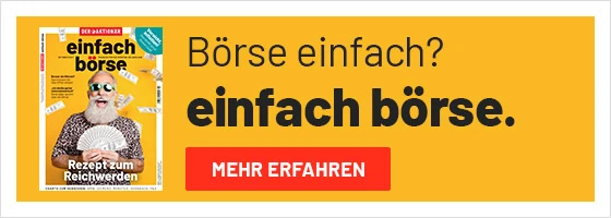 Jetzt zugreifen und das geballte Börsenwissen sichern: einfach börse, das Monatsmagazin von DER AKTIONÄR, können Sie jetzt mit dem Willkommenspaket zum exklusiven Vorteilspreis ins Depot holen: Lesen Sie das Monatsmagazin ein Jahr lang für nur 50 Euro und erhalten Sie als Geschenk den Bestseller „Die Börsen-Zauberformel“ dazu.