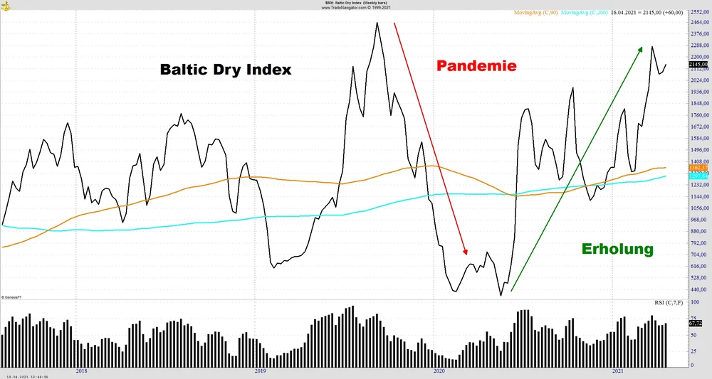 Die Volkswirtschaften weltweit erholen sich mit unterschiedlicher Geschwindigkeit. Um einen Überblick zu bekommen wie stark die Nachfrage nach Rohstoffen momentan ist macht es Sinn sich die Preisentwicklung des „Baltic Dry Index“ anzusehen. Dieser ist ein wichtiger Preisindex für das weltweite Verschiffen von Gütern wie Kohle, Eisenerz und Getreide und spiegelt damit die Aktivität auf den wichtigsten Handelsrouten wieder.