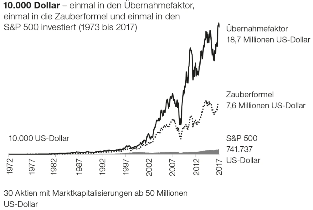 Vor fünfzehn Jahren erschien ein Büchlein von Joel Greenblatt. Greenblatt hatte als Gründer und Manager von Gotham Capital mit seinem Team einen durchschnittlichen Jahresertrag von 40 Prozent erzielt. In „Die Börsen-Zauberformel“ erklärte er in einfachen Worten, wie jeder den Markt mit Leichtigkeit schlagen kann. Mit Greenblatts Zauberformel hätten Anleger die Performance des S&P 500 im Lauf der Jahre um das Zehnfache übertroffen. An diese Formel knüpft nun „Im Einkauf liegt der (Börsen-)Gewinn“ von Tobias E. Carlisle an. Auch Carlisle braucht weniger als 200 Seiten, um seinen Ansatz zu vermitteln. Das Besondere: Carlisle, wie Greenblatt ein professioneller Portfoliomanager, bewertet Unternehmen mit einem „Übernahmefaktor“. Dessen konsequente Anwendung lässt selbst die Zauberformel verblassen. Aus einer Investition von 10.000 Dollar wären nach 45 Jahren 18,7 Millionen Dollar geworden (siehe Grafik).
