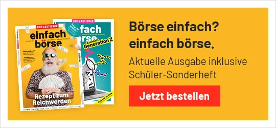 Übrigens: Informativ, unterhaltsam und mit jeder Menge Input für Ihre Geldanlage bringt einfach börse Ihnen jeden Monat die Aktienwelt näher. Das Monatsmagazin gibt es entweder als Einzelheft oder im Willkommenspaket zum Vorteilspreis: Lesen Sie einfach börse ein Jahr lang und erhalten Sie den Bestseller „Die Börsen-Zauberformel“ als Geschenk dazu.