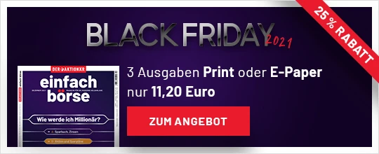 Mit dem Black-Friday-Aktionsabo können Sie einfach börse jetzt sogar zum exklusiven Vorteilspreis lesen und erhalten 3 Ausgaben für nur 11,20 Euro. Das Black-Friday-Aktionsabo ist nur noch bis zum 29. November (23:59 Uhr) gültig – ebenso wie weitere unschlagbare Black Friday Deals von DER AKTIONÄR. Wer zugreifen will, sollte also nicht zögern.