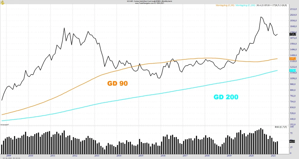 Die wirksamste Möglichkeit, gegen eine steigende Inflation anzukämpfen sind steigende Zinsen, im derzeitigen Umfeld würde eine Zinserhöhung aber verehrende Folgen haben. So bleibt es aktuell bei verbalen Beschwichtigungen von Seiten der Notenbanken, dass sie „alles im Griff haben“. Wir wissen aber, dass eine Inflation schwer zu kontrollieren ist, wenn sie einmal an Fahrt aufgenommen hat. Behalten die Analysten Recht, und der CPI kommt wie erwartet mit +2,50 Prozent, wird es vermutlich zu keiner großen Marktbewegung kommen. Bei einer Überraschung könnte aber eine größere Bewegung an den Finanzmärkten ausgelöst werden. Die Rendite der 10 jährigen amerikanischen Staatanleihen stieg von den Tiefstständen im August 2020 von 0,52 Prozent auf aktuell 1,69 Prozent und ist nicht mehr weit von den Höchstständen Ende März bei 1,74 Prozent entfernt. Ein weiterer Renditeanstieg könnte die Rally am Aktienmarkt abrupt beenden und auch die hochverschuldeten Unternehmen in der Realwirtschaft in Bedrängnis bringen. Gold hat seit seinem All-Time-High im August bei 2.100 Dollar knapp 20 Prozent korrigiert und scheint im Bereich von 1.670 Dollar einen Doppelboden ausgebildet zu haben, sollte es zu einer größeren Abweichung kommen, wird es voraussichtlich eine starke Bewegung geben. Schlusskurse über 1.760 Dollar würden den Weg freimachen um die psychologisch wichtige 1.800 Dollar Marke wieder zu knacken.