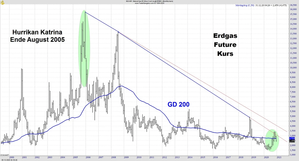 Der Erdgas-Future findet momentan keinen Boden. 48 US-Staaten haben aktuell Temperaturen, die über den historischen Durchschnitten liegen. Das lässt die Nachfrage einbrechen und drückt den Preis des Rohstoffes. Der Markt geht davon aus, dass die Lagerbestände über den vom letzten Jahr liegen und möglichweise sogar über dem fünf Jahresdurchschnitt. Wie in fast allen Rohstoff-Märkten ist auch hier China aktuell der Hauptabnehmer. Aber für wirklich steigende Preise reicht das kaum. Technisch ist der Markt überverkauft, der Griff in das fallende Messer sollte aber vermieden werden. Ein Bodenbildung ist überfällig.