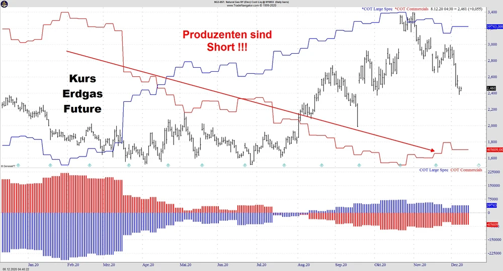 Die Produzenten sind immer noch -65.609 Kontrakte short, die großen Fonds halten mit einer Long-Position im Ausmaß von +39.743 Kontrakten dagegen. Schaut man sich die historische saisonale Entwicklung an, ist von weiter fallenden Kursen auszugehen.