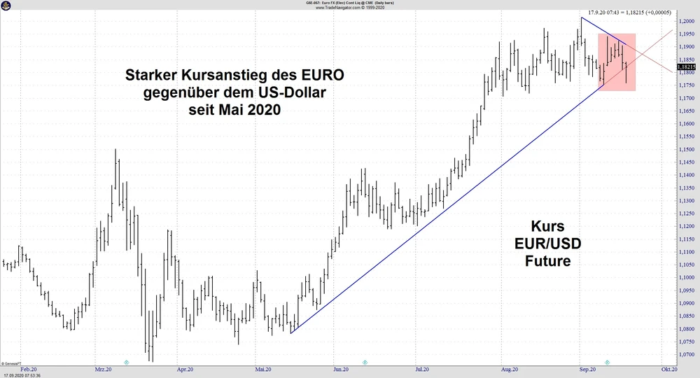 Nach der Notenbanksitzung der FED am 16. September gab der Euro seine kompletten Tagesgewinne wieder ab und schloss im Minus. FED-Chef Jerome Powell stellte die Anleger auf eine lange Niedrigzinsphase ein und erklärte, das die Währungshüter die Zinsen so lange in der derzeitigen Spanne von 0,0 bis 0,25 Prozent belassen werden, bis Vollbeschäftigung herrscht und die Inflation bei zwei Prozent liegt. Nach dem gestrigen Kursrutsch unter die Unterstützung bei 1,1770 ist die europäische Währung jedoch auch charttechnisch angeschlagen und es droht ein weiterer Abverkauf. Der Ausbruch aus dem kurzfristigen Dreieck nach unten sowie ein mögliches Unterschreiten des gleitenden 50 Tagesdurchschnittes könnte eine größere Verkaufswelle auslösen.