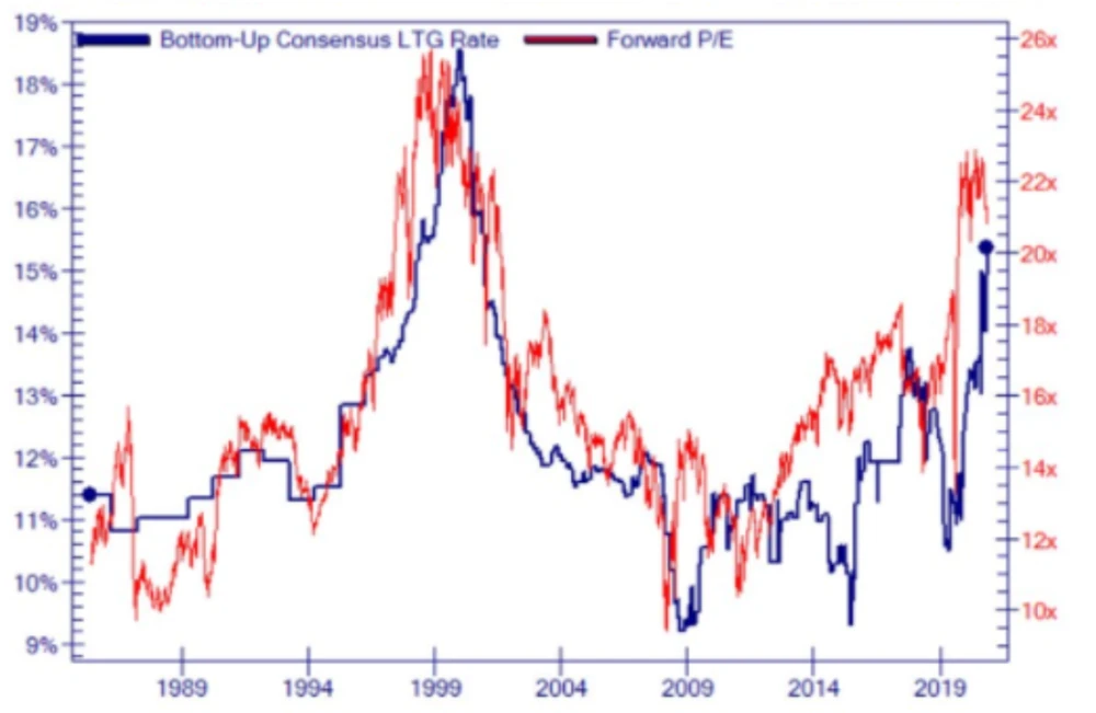 Die Schätzung der langfristigen Wachstumsrate (LTG Rate) der einzelnen Unternehmensgewinne auf den Index hochgerechnet (Bottom Up) verläuft dabei in den letzten fast 40 Jahren parallel zum Kursgewinnverhältnis. Das ist auch vollkommen richtig so, denn wenn die Unternehmensgewinne mit einer jährlichen Rate von 18 Prozent wachsen, ist ein hohes Kursgewinnverhältnis durchaus angemessen, da die Gewinne ja in den Bewertungsrahmen schnell hinein wachsen.