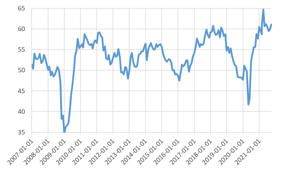 Im etwa vierjährigen Rhythmus, „Kitchin“-Zyklus genannt, traten in den USA Wirtschaftsabschwächungen beziehungsweise sogar Rezessionen auf, wie in den Jahren 2008, 2012, 2016 und zuletzt 2020. So sollte es jetzt noch nicht an der Zeit für eine schwere Wirtschaftskrise sein. Die jüngste, auch im Verlauf des ISM ablesbare, Delle lässt sich einerseits mit der - in USA mittlerweile wieder abklingenden - Delta-Welle und andererseits mit Engpässen bei der Produktion erklären. Im Jahr 2020, geschockt von der Corona-Pandemie, investierten die Unternehmen in Erwartung sinkender Nachfrage wenig in neue Produktionskapazitäten.