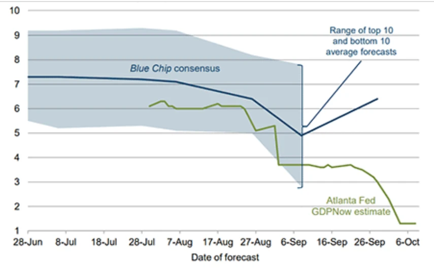 Nach 6,5 Prozent im zweiten Quartal scheint die US-Wirtschaft im dritten Quartal nur noch mit einer Rate von 1,3 Prozent gewachsen zu sein, wie die Schätzung der Atlanta-Filiale der amerikanischen Notenbank auf der unten stehenden Grafik zeigt.
