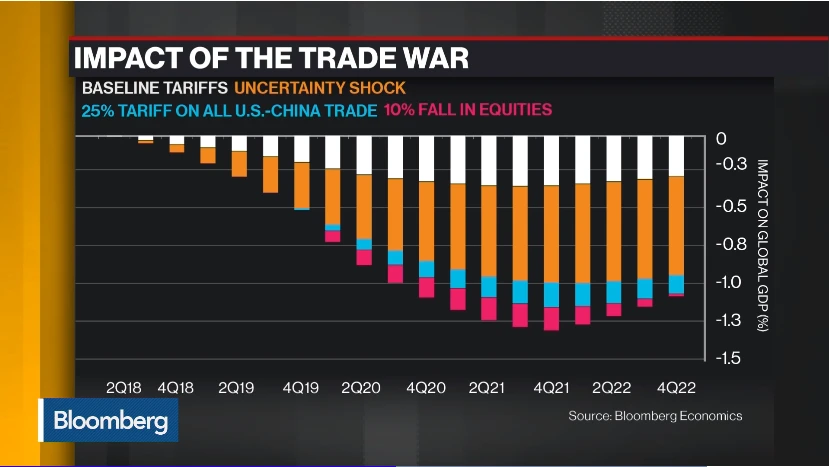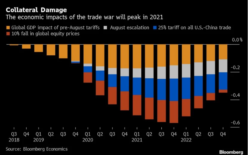 Die Analysten gehen dabei von aus, dass die Folgen des Handelskrieges am stärksten 2021 zu spüren sein werden (siehe Grafik unten). In der Spitze könnte die Weltwirtschaft, sprich das weltweite GDP, um mehr als 0,6 Prozent fallen.