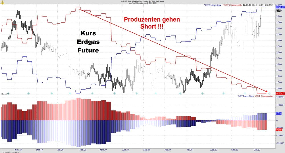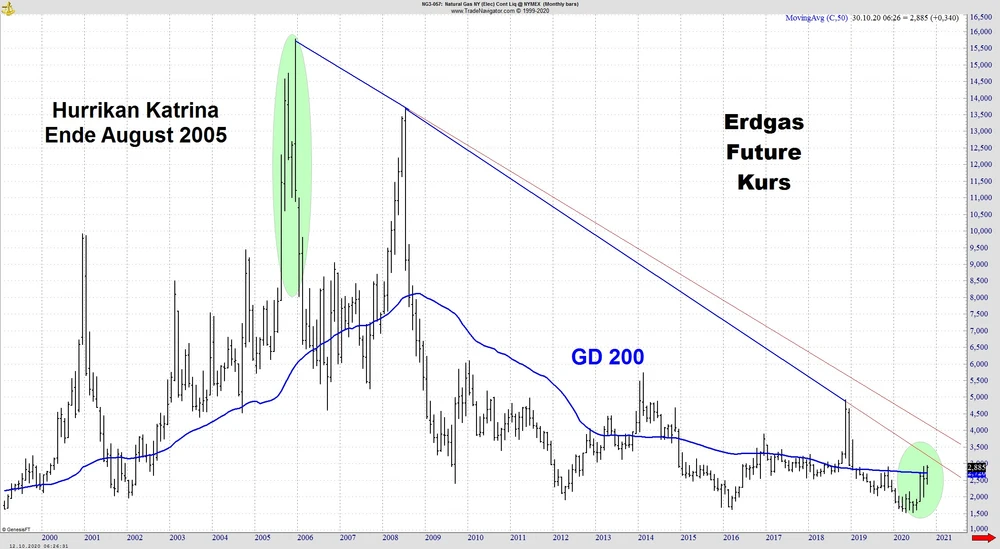 Letzte Woche notierte der Erdgas-Future noch bei 2,50 US-Dollar, in nur drei Handelstagen explodierte der November Kontrakt um mehr als 20 Prozent und kämpft mit der 3 US-Dollar Marke. Seit Freitag, 09.10.2020, wurden 62 Prozent der Nat-Gas-Anlagen im Golf von Mexico geschlossen. In der diesjährigen Wirbelsturm-Saison, die von Juni bis November dauert, haben sich bereits so viele Stürme gebildet, dass die 21 in alphabetischer Reihenfolge vorgesehenen Namen aufgebraucht sind. Somit wird die 2020er Hurrikan Saison vermutlich in die Geschichtsbücher eingehen, und selbst die 2005er Saison mit dem bekannten Hurrikan Katrina übertreffen. Der Erdgas-Future ist kurzfristig stark überkauft, notiert aber seit Anfang September wieder zum ersten Mal über dem wichtigen 200 Tages Durchschnitt bei 2,84 US-Dollar.