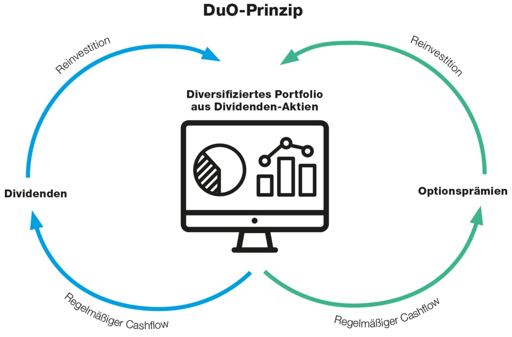 Nachdem Rabe dem Leser in einer anschaulichen und leicht verständlichen Sprache die Grundlagen der Optionsmaterie erklärt, zeigt er im weiteren Verlauf auf, wie man mithilfe von Optionen sich ein diversifiziertes Portfolio aus guten Dividendentiteln aufbaut (siehe Grafik). Der Autor gibt dem Leser dabei alles an die Hand, um ebendiese Aktien zu finden. „Betrachte dein Depot wie eine Art Mehrfamilienhaus. Bloß wohnen in den einzelnen Wohnungen keine Menschen, sondern Unternehmen, die regelmäßig Miete zahlen.“