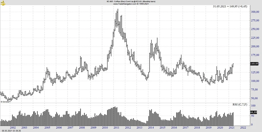 Das seit Wochen positive Momentum wurde durch den starken brasilianischen Real weiter befeuert, der gestern gegen dem US-Dollar 1,6 Prozent zulegen konnte. Der ausbleibende Regen und die Wetterprognose der Agrarwissenschaftler von Somar Meteoroliga, die für die Hauptanbaugebiete des Arabica Kaffees bis zum 25. Mai weiterhin Trockenheit vorhersagen, sollte die Rally unterstützen. Der Kolumbianische Kaffee Verband berichtete von zunehmenden Schwierigkeiten die Kaffee Lieferungen zu den Verschiffungshäfen zu transportieren, da die Zufahrtswege von Demonstranten, die gegen eine Steuerreform protestieren, blockiert werden. Üblicherweise erreicht die Kaffeeernte Mitte Mai ihren Höhepunkt, die ohnehin schon deutlich niedriger erwartete Ernte könnte durch den ausbleibenden Regen nochmals schwächer ausfallen.