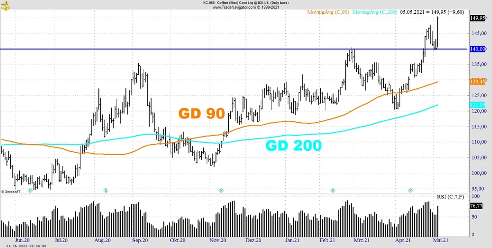 Endlich schaffte es auch der Kaffee-Future die alten Widerstande bei 142 US-Cent nach oben zu durchbrechen und konnte gestern den größten Tagesgewinn seit über einem Jahr verzeichnen. Technisch stehen jetzt die Ampeln auf grün, das nächste Kursziel sind die alten Hochs aus dem Dezember 2019 bei 156 US-Cent.