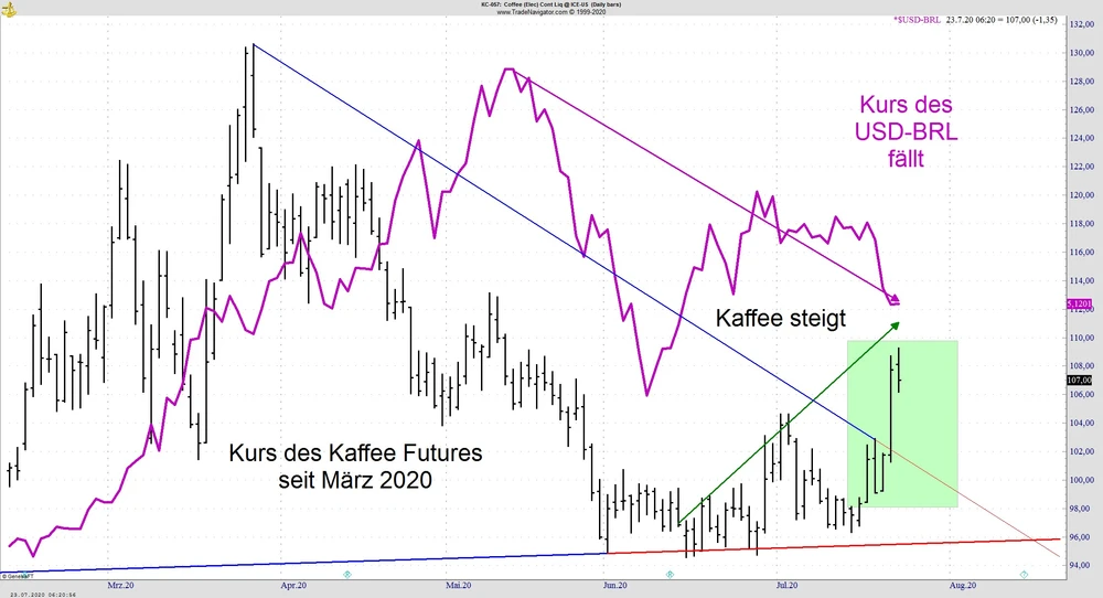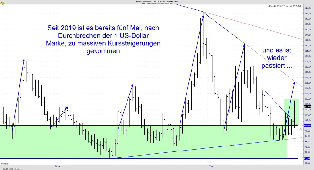 Nach der sechswöchigen Bodenbildung und einem gescheiterten Fehlausbruch Anfang Juli, ist es dem Kaffee am Terminmarkt am Donnerstag endgültig gelungen, nach oben auszubrechen. Ein Tagesplus von sechs Prozent mit deutlich anziehenden Umsätzen katapultierte den Kaffee-Future über die wichtige Marke von 105 US-Cent.