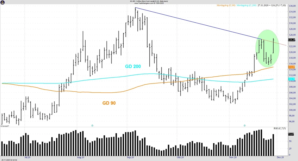 Nach einer dreitägigen Konsolidierung knapp unter 120 US-Cent war es am Freitag soweit: Der Kaffee-Future eröffnet mit einem Gap-up und Durchbrach die Marke von 120 US-Cent mit Leichtigkeit. Im Anschluss erreichte der Future bei einem starken Volumen ein neues Neun-Wochen-Hoch und beendete den Handelstag mit einem Plus von sechs Prozent.