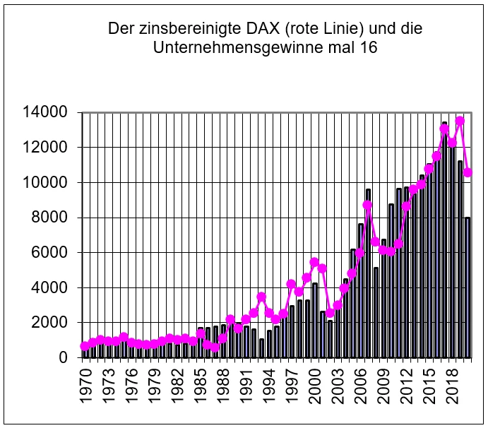Ich hatte für mein Anfang des Jahres 2012 erschienenes Büchlein „Warum der DAX auf 10.000 Punkte steigt“, - der DAX notierte damals bei 6.000 Punkten - eine Grafik erstellt, die mich zu dieser optimistischen Aussage veranlasste. Dazu habe ich die Unternehmensgewinne der letzten Jahrzehnte mit der Kursentwicklung der deutschen Aktien verglichen. Nicht mit dem DAX selbst, sondern ich habe den jeweiligen DAX-Jahresschlusskurs mit einem Faktor multipliziert, der sich aus dem langfristigen Zins, der Anleiherendite, ergab. Somit wurde dem Einflussfaktor Rechnung getragen, dass bei einem höheren Zins ein niedrigeres Kurs-Gewinn-Verhältnis angemessen ist. Diesem zinsbereinigten DAX habe ich Unternehmensgewinne pro DAX mit dem Faktor 16 multipliziert gegenübergestellt.