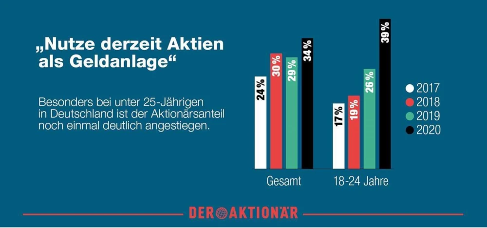 Jetzt im Jahr 2020 ist es wieder soweit – die Jugend kämpft für die grüne Revolution. Mit einem Unterschied: Sie stürmt nicht nur die Straßen, sondern aktiv das Parkett und kauft Solar-, Wasserstoff- oder E-Auto-Firmen. Diese neuen Zahlen von Pro Aktie sind wirklich beeindruckend: 39 Prozent der Deutschen zwischen 18 und 24 setzen mittlerweile auf die Aktie – satte 22 Prozentpunkte mehr als noch vor drei Jahren! In der Altersklasse der 25- bis 34-Jährigen sind starke 59 Prozent der Ansicht, dass sie noch mehr aus ihrem Vermögen machen könnten. Sie haben recht, mit etwas Mut und Glaube an die Zukunft ist so viel mehr möglich.