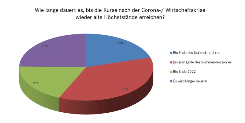Und auch Deutschlands Privatanleger schauen trotz Lockdown und Corona-Einschränkungen mehrheitlich zuversichtlich in die Zukunft. Immerhin glauben 20 Prozent trotz absehbarer Wirtschaftskrise an alte Höchststände an den Aktienmärkten noch in den verbleibenden Handelswochen 2020. Weitere 36 Prozent gehen davon aus, dass sich die Märkte bis zum Ende des kommenden Jahres erholt haben werden. Wohingegen die übrigen 44 Prozent der Teilnehmer an der November-Umfrage des Deutschen Derivate Verbands (DDV) deutlich pessimistischer sind. Denn 19 Prozent sehen eine Erholung der Märkte erst Ende 2022, wohingegen knapp 25 Prozent von einer vollständigen Erholung in noch fernerer Zukunft ausgehen.