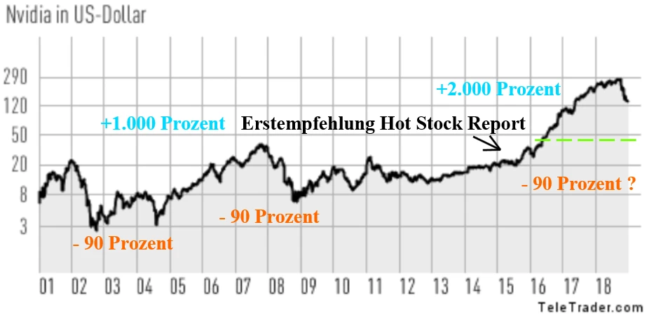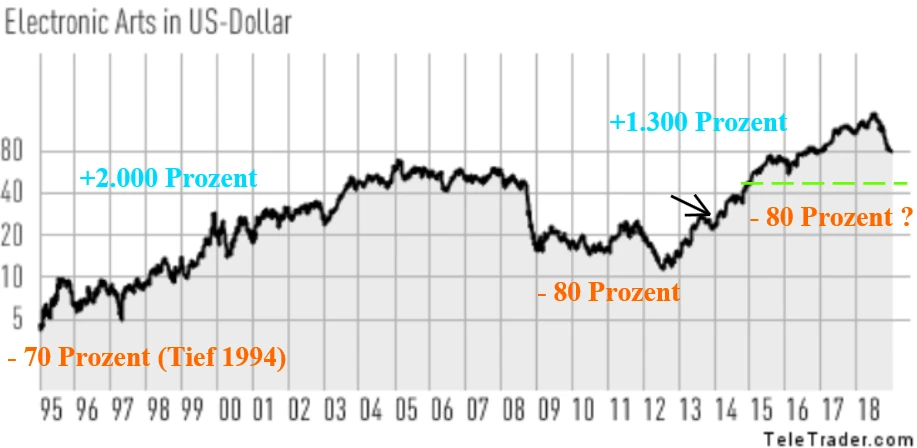 Am wichtigsten in einer Krise: auf Aktien mit einer sauberen Bilanz und stimmigen Zukunftsperspektiven setzen. Dann das Timing per Charttechnik: EA und Nvidia sind gute Beispiele. Große Korrekturen (solche halte ich für wahrscheinlich) haben hier zwischen 70 und 90 Prozent Kursverlust bedeutet. Aktuell sind wir bei EA „erst“ bei minus 50 Prozent. Das ist unser Grob-Timing-Szenario, auf welches wir 2019 setzen: Wir wollen nicht zu früh, sondern nahe der Tiefstände (idealerweise mit TFA-Signal) einsammeln. Dann gehen wir mit Ziel 1.000 Prozent all in. Bis dahin werden wir kleinere Rebound-Trades machen, um das Gefühl für den Markt zu behalten und auch von überraschend bullishen Szenarios direkt zu profitieren.