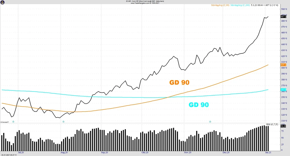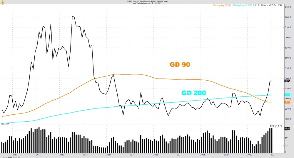 Der in Chicago gehandelte Mais-Future erreichte am Dienstag bei 497,75 Cent pro Scheffel den höchsten Stand seit 2014. Unglaubliche 54 Prozent hat der Preis seit August 2020 bis Jahresende zugelegt, allein in der zweiten Dezember-Hälfte waren es fast 15 Prozent. Der Kursanstieg wird einerseits von der Nachfrage nach Futtermais aus China, andererseits wegen der anhaltenden Trockenheit in Südamerika angetrieben.
